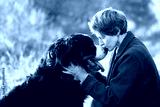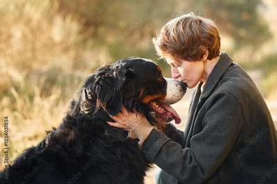A woman and her Bernese Mountain Dog share a quiet, affectionate moment in a grassy field.