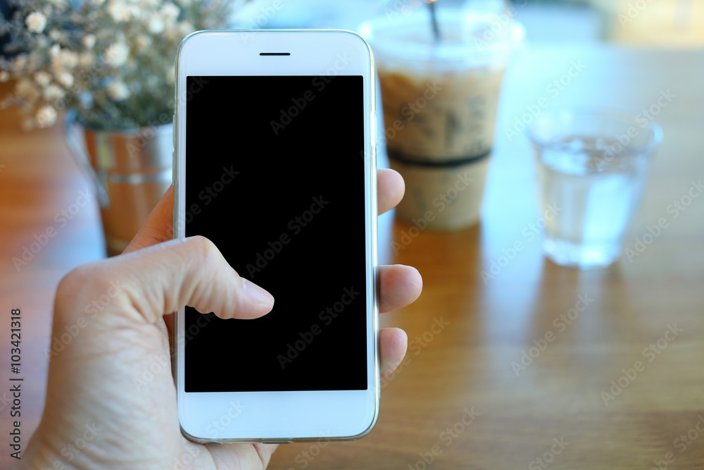 Hand holding smartphone with coffee shop background