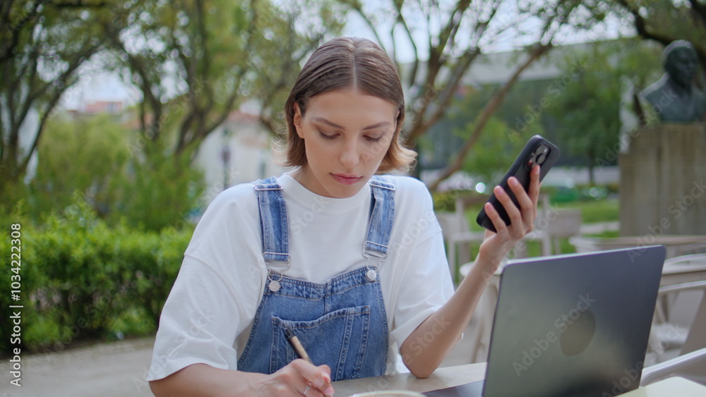 Serious freelancer making notes in notebook at outdoors cafeteria closeup.