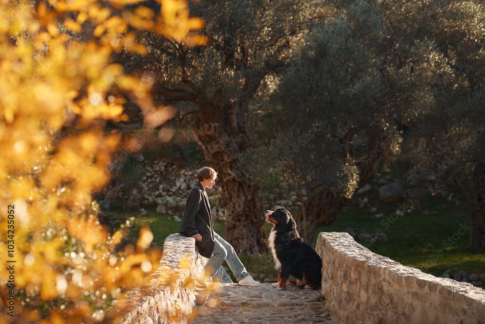 A woman walks with a Bernese Mountain Dog along a rustic stone path surrounded by nature.