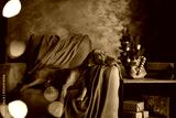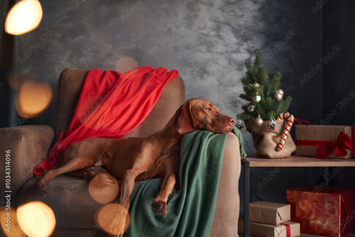 A poised Vizsla dog in festive attire lounges on a couch, embodying the relaxed essence of holiday leisure