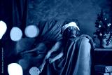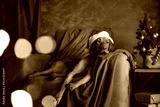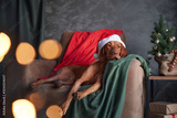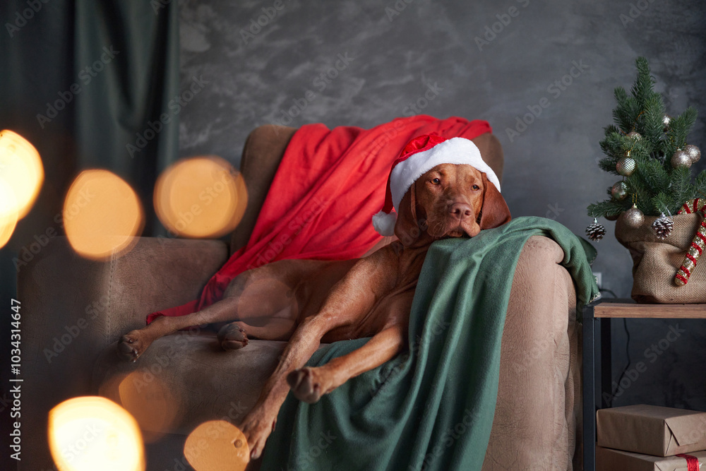 Poised and peaceful, a Vizsla dog wears a Santa hat, ready to celebrate the festive season on a comfortable couch