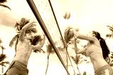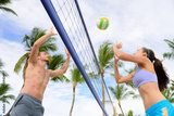 Friends playing beach volleyball sport. Woman and man having fun recreational volley ball game in summer living healthy active sport lifestyle.