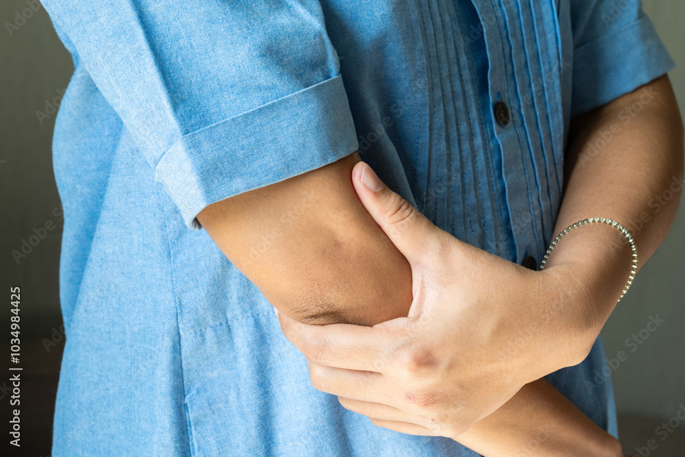 woman has pain in his elbow and tendon muscles and he relieves the pain with a massage. Health and healing concept
