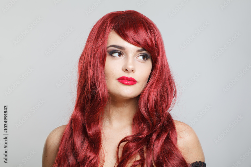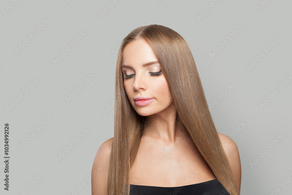 Happy fashion model woman in blue classic hat and white fur coat posing indoor, elegance fashion beauty portrait