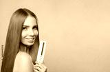 Healthy brunette lady with straight hair holding straightening iron on white background. Female beauty, coiffure, hair care, cosmetic and styling concept