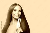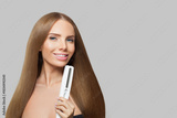 Good-looking fashion model with brown shiny straight haistyle portrait. Cute woman with straightening iron in her hand on gray studio background