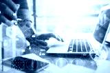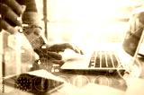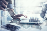 Business concept, businessman working laptop. Generic design notebook on the table. Worldwide connection technology interface, horizontal mockup.