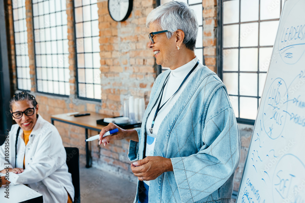 Cheerful senior businesswoman leading a successful meeting with enthusiasm and confidence in a contemporary workspace