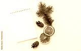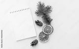 Creative holiday composition with blank notebook mock up, dried orange and pine cone on white background. To do list, planner and goals concept. Christmas, autumn concept. Flat lay, top view
