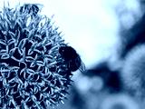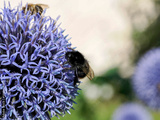 bees collecting pollen on purple flower black garlic in dolomites mountains macro close up detail