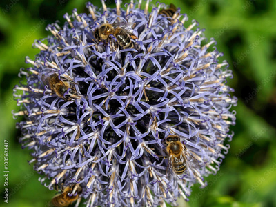 bees collecting pollen on purple flower black garlic in dolomites mountains macro close up detail