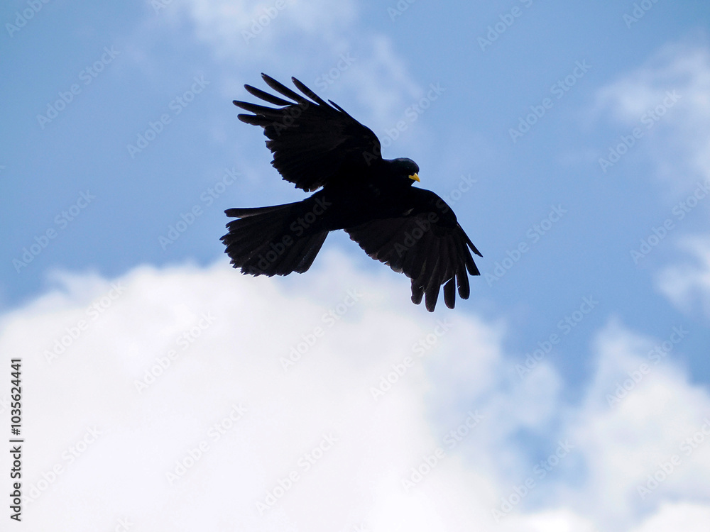 Pyrrhocorax graculus, or Alpine Chough, on Dolomites alpine landscape flying free