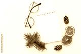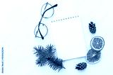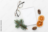 Creative holiday composition with blank notebook mock up, dried orange, glasses and pine cone on white background. To do list, planner and goals concept. Christmas, autumn concept. Flat lay, top view