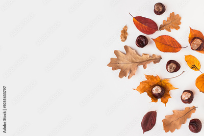 Autumn holiday frame composition with dry leafs and chestnuts on white backround. Creative layout pattern, Thanksgiving day flat lay, Halloween. Eco zero waste concept. Top view, place for text banner
