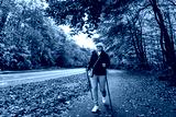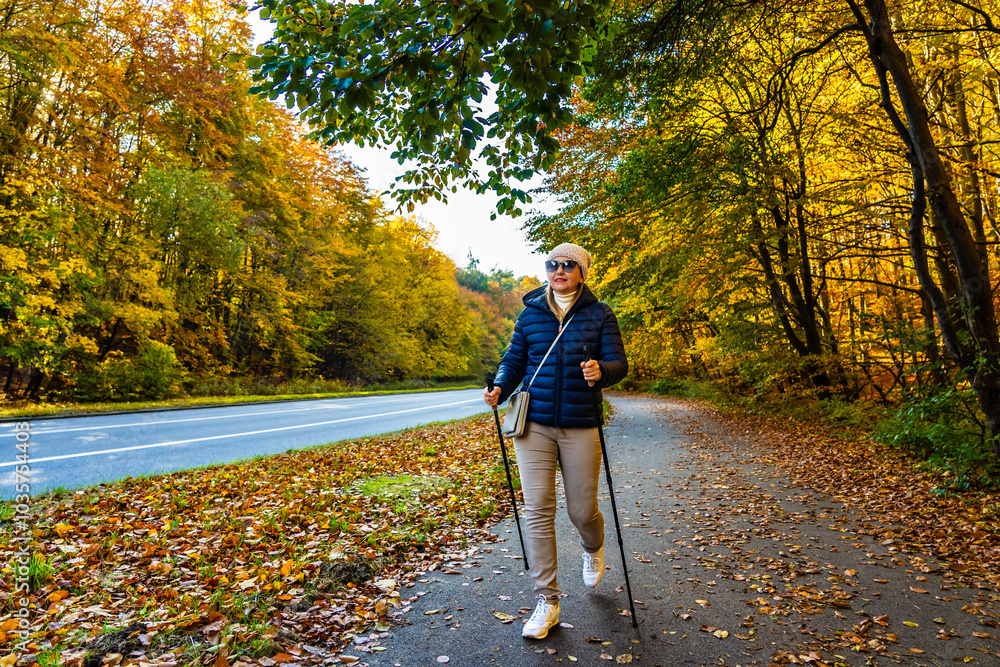 Beautiful middle-aged blonde woman in casual wear walking with poles on sidewalk by street in autumn scenery. Front view. Autumnal Nordic walking in city.