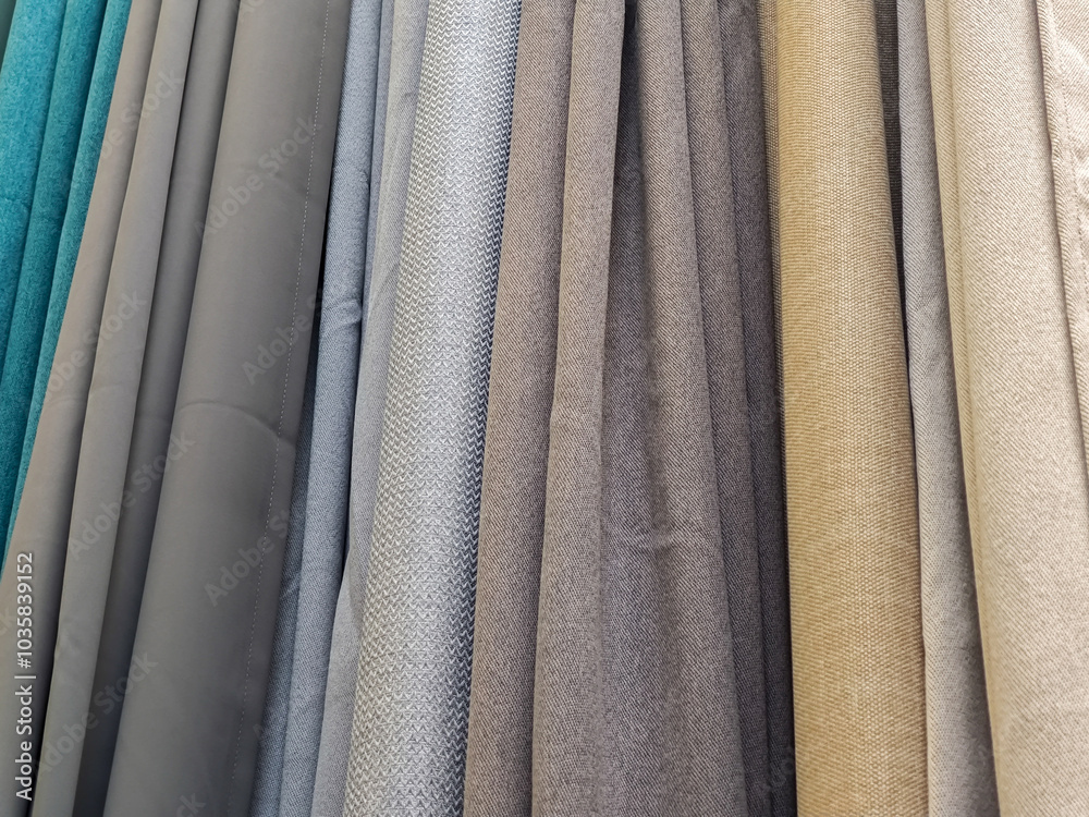 Selection of different colored curtains displayed in a store, various bright fabric textures and materials in neutral tones, home decor curtain options interior design window treatments shop display