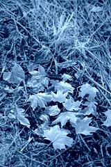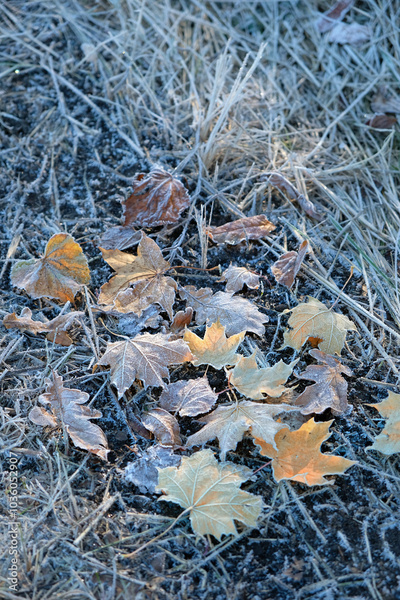 beautiful autumn nature background. dry frozen fallen leaves and grass in hoarfrost. cold weather, late fall season, first freezing. template for design