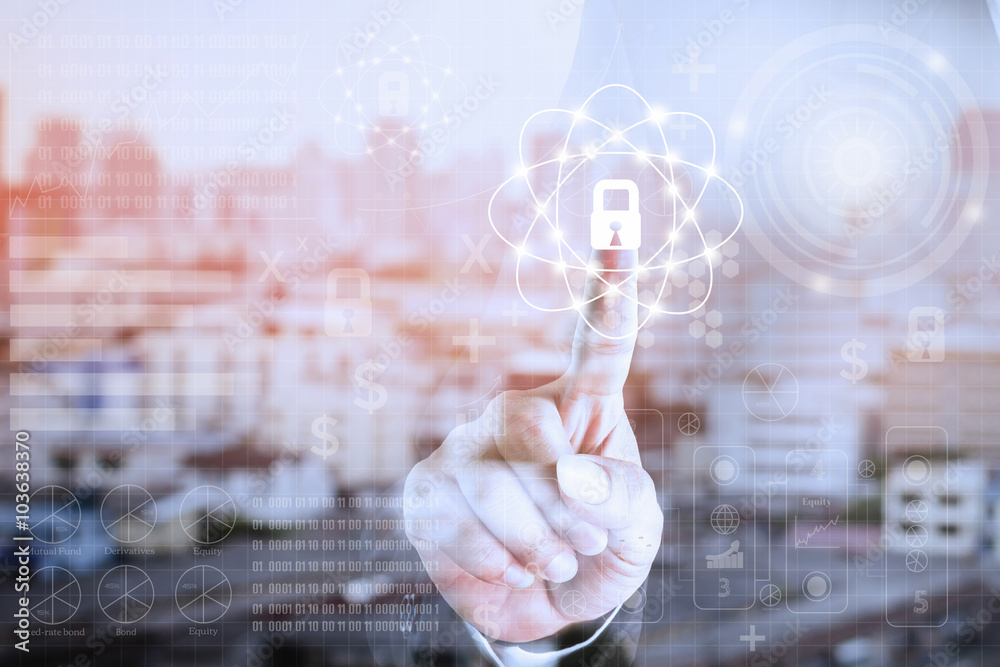 Business hands of a touch screen with a. padlock denoting security. Can be deployed to create your ad.