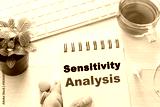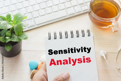 Man holding Sensitivity Analysis message on book and keyboard with a hot cup of tea, macaroon on the table. Can be attributed to your ad.