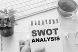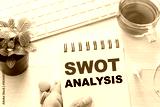 Man holding SWOT ANALYSIS message on book and keyboard with a hot cup of tea, macaroon on the table. Can be attributed to your ad.