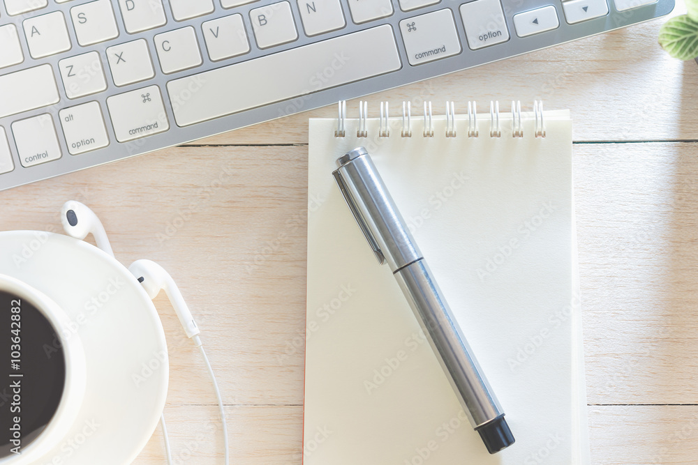 Office workspace with keyboard notepad coffee of cup on wood table.