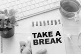 Man holding TAKE A BREAK message on book and keyboard with a hot cup of tea, macaroon on the table. Can be attributed to your ad.