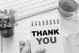 Man holding THANK YOU message on book and keyboard with a hot cup of tea, macaroon on the table. Can be attributed to your ad.