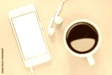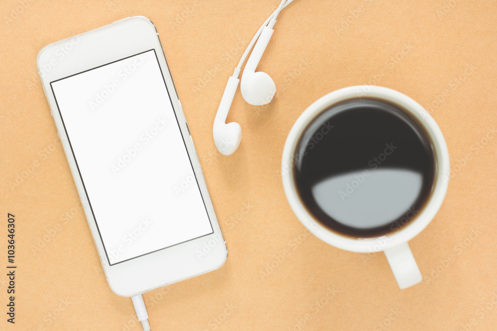 Phone, headset with glass coffee on table in brown background.