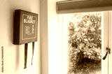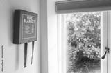 Newly installed generic Fire Blanket stowage kit seen by a rear window in a typical kitchen environment. The window shows the small garden area at the back of the kitchen.