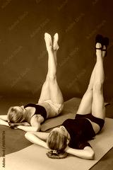 fitness, sport, training and lifestyle concept - smiling two sporty women doing exercises on mat in gym
