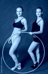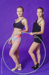 fitness and gym concept -Two young sporty women smiling with hula hoop at gym.on a blue background