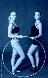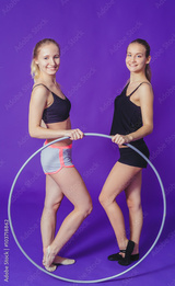 fitness and gym concept -Two young sporty women smiling with hula hoop at gym.on a blue background