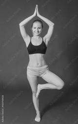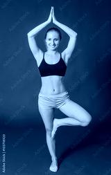 woman doing exercises while standing on a blue background in the fitness room