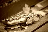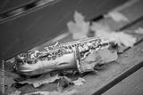 The saxophone lies on a rain-wet park bench among fallen autumn maple leaves.