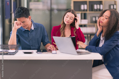 Company meeting A diverse team of frustrated businessmen feels hopeless due to poor results or poor statistics. Disgruntled co-workers shocked by negative bankruptcy news