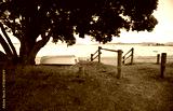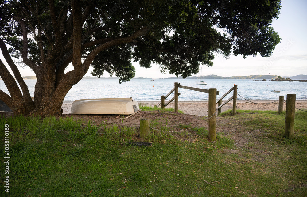 Boat under the giant Pohutukawa tree. Tapeka Point beach. Russell. Bay of Islands.