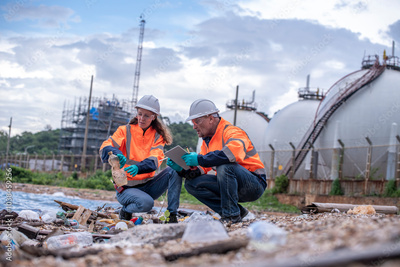 Environmental scientists or workers, wearing safety helmets and gloves, examining waste materials along a shoreline are large industrial tanks environmental waste water or pollution effects concept.