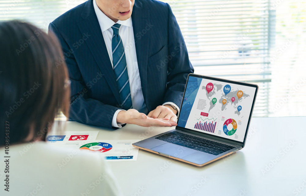 商談、ビジネス、提案、プレゼンテーション、プレゼン、画面、投資、資産運用、FP、アドバイザー、ファイナンシャルプランナー、面談、会議、ミーティング、打ち合わせ、コンサル、コンサルタント、コンサルティング、営業、ビジネスパーソン、ビジネスマン、男性、女性、接客、販売、ETF、人材、スーツ、オフィス、ノートパソコン、PC、DX、グローバル、インデックス、説明、研修、経済、金融、商品、マーケティング、マ