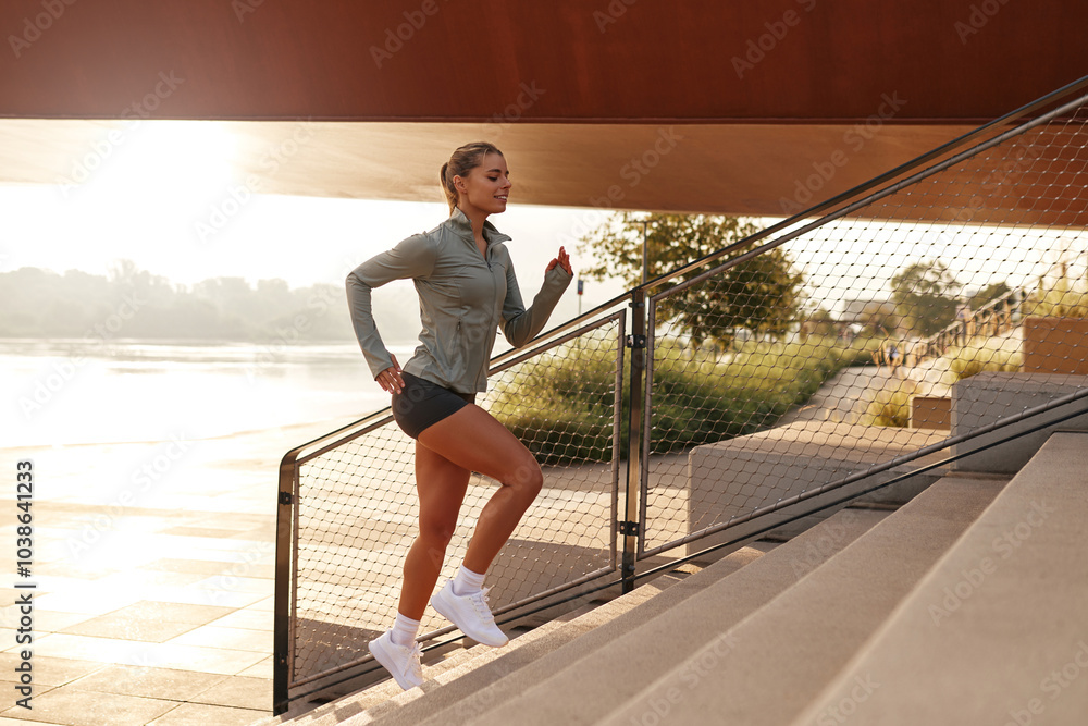 A woman is jogging up the stairs at sunrise, enjoying the beautiful view by the water