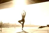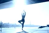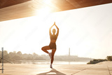 Experience a sunlit yoga practice by the serene riverside at the beautiful break of dawn