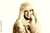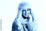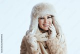 smiling modern woman in winter coat and fur hat on white