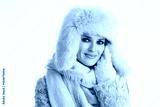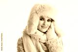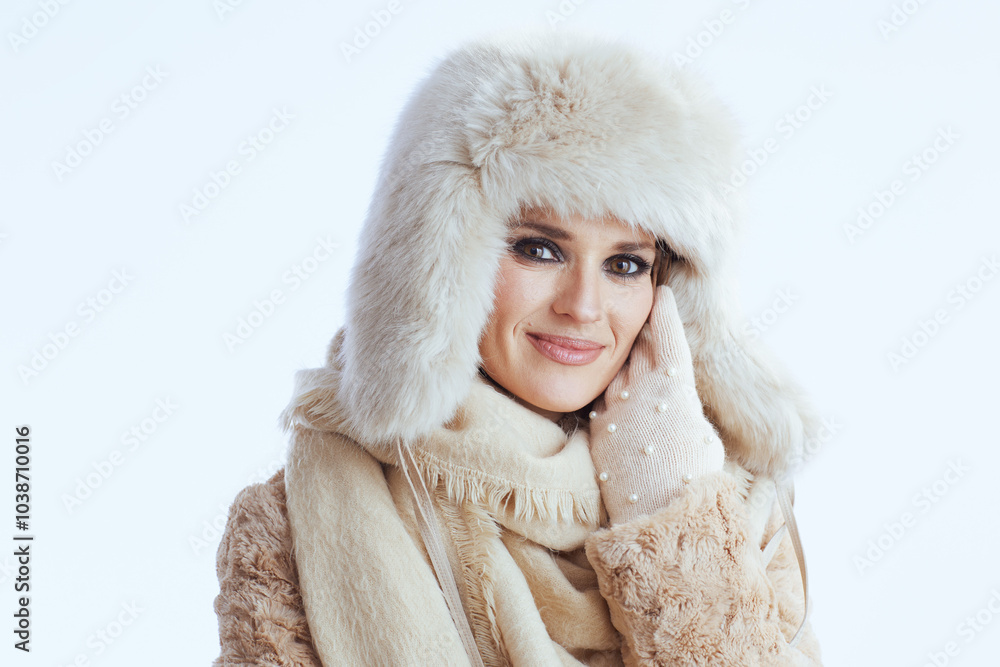 smiling woman in winter coat and fur hat touching face on white