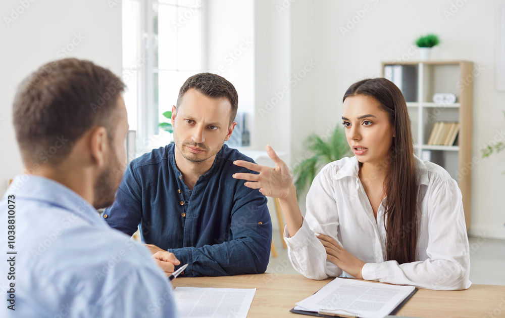 Family couple engages in a briefing and conversation with a real estate consultant or insurance agent in the office. They discuss important aspects of the contract and finalize the deal.