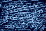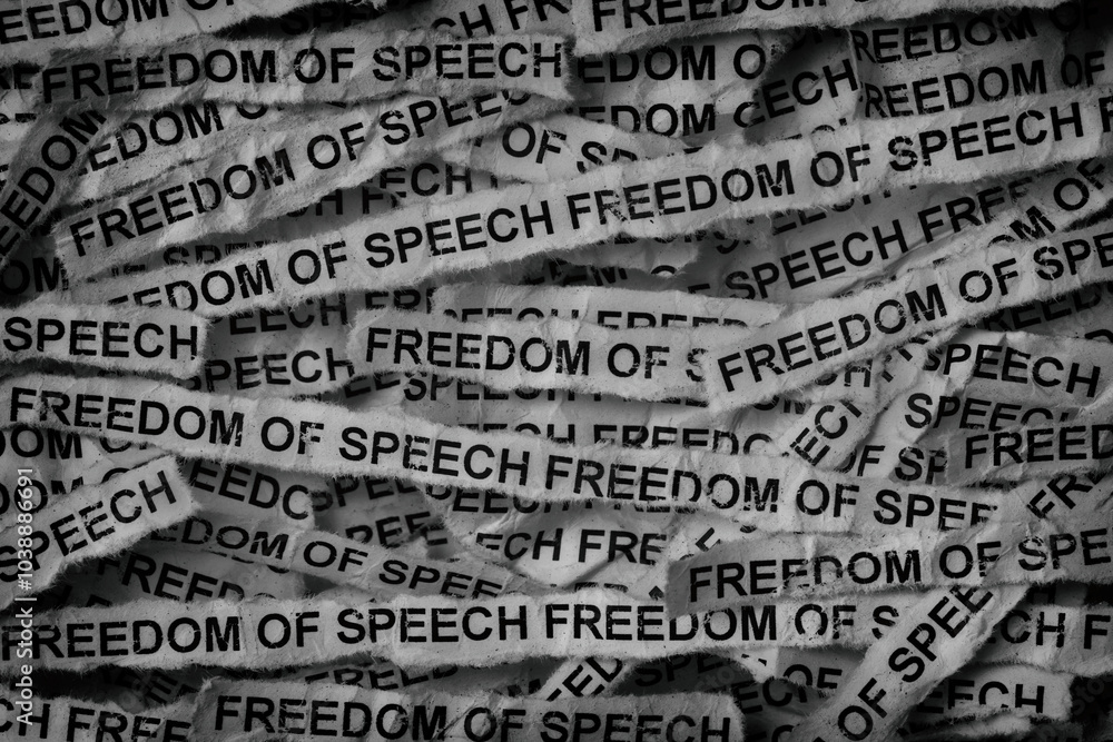 Strips of newspaper with the words Freedom of speech typed on them. Black and white. Close up.