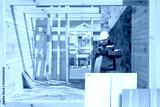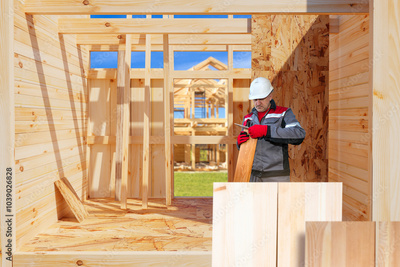 Construction wooden houses. Male builder holds board in his hand. Erection of timber buildings. Builder in gray uniform on construction site. Erection frame houses. Construction of timber buildings