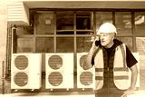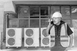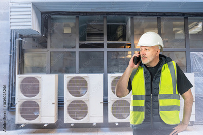 Man engineer. External air conditioners units on wall. Engineer near split equipment. Air conditioners installer is talking on phone. HVAC equipment on wall building. Man servicing air conditioners
