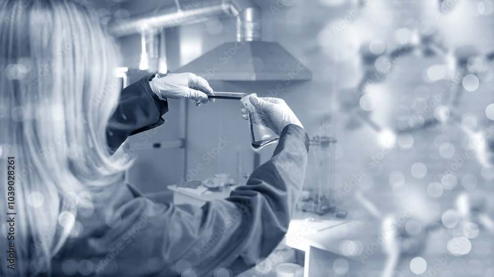 Woman laboratory assistant with flask in hands. Girl biologist. Chemist in laboratory. Scientist pours liquid into another test tube. Biologist works with reagents. Woman lab assistant back to camera
