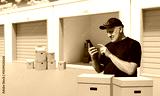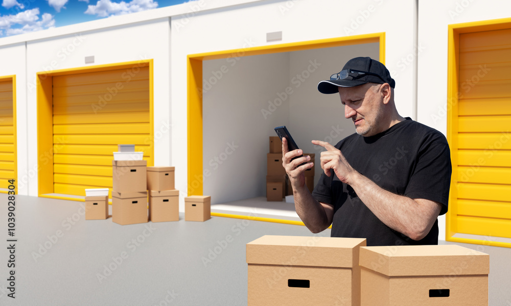 Man near storage unit. Guy is tenant of self warehouse garage. Owner of pantry uses telephone. Rent outdoor storage unit via smartphone. Man smiling standing in front of storage boxes