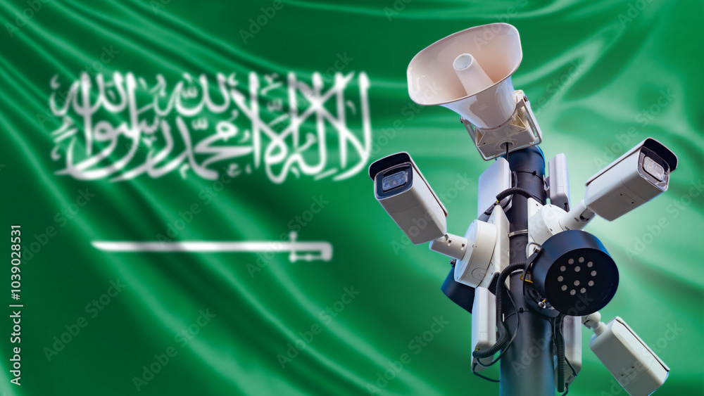CCTV cameras. Flag Saudi Arabia. Security cameras hang on pole. Security systems for cities in Saudi Arabia. CCTV equipment. Megaphone for notification emergency events. CCTV with Saudi Arabia symbol